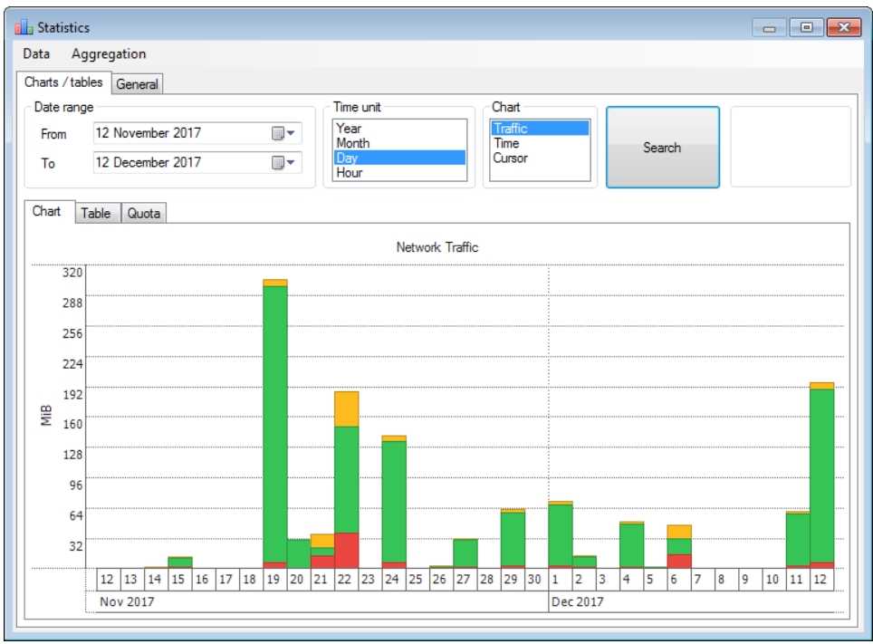 В программе можно просмотреть, какое количество информации было получено и отправлено за каждый час, день, месяц, а также можно поставить свой собственный промежуток времени. Это приложение также умеет устанавливать квоту на использование трафика в день, т. е. напоминать пользователю, когда интернет-трафика использовано больше определенного процента от числа, которое можно потратить за день.