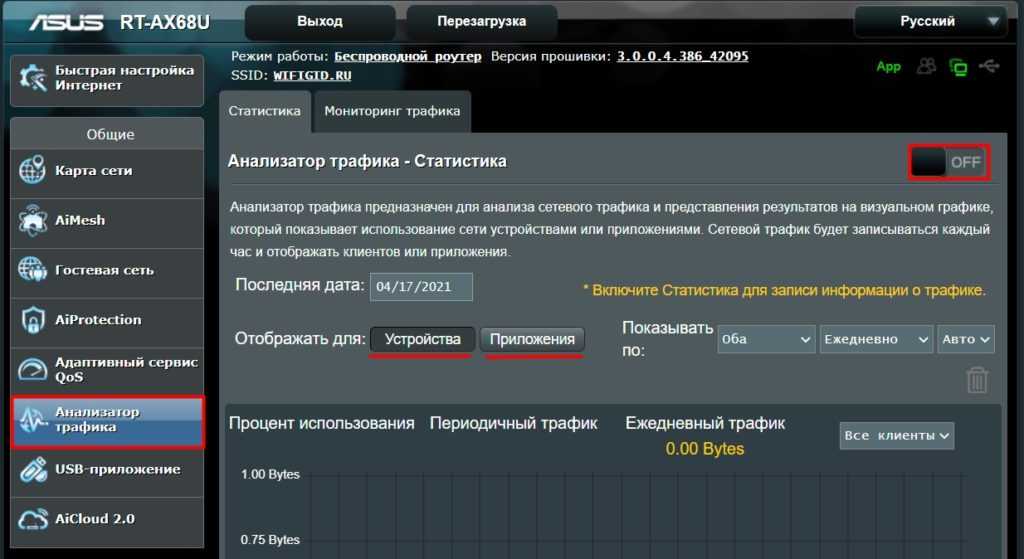 Переходим в «Анализатор трафика» и обнаруживаем, что это достаточно большой и информативный раздел. Сначала нужно включить функцию на вкладке «Статистика». Здесь же можно смотреть трафик не только по подключенным устройствам, но также по приложениям. Можно просмотреть график по выделенной дате.