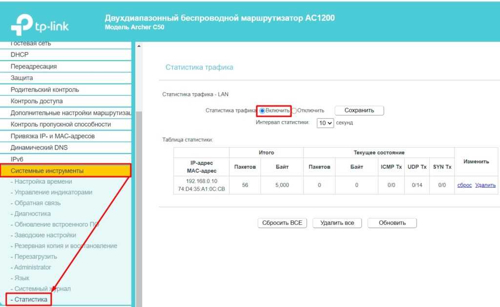 Переходим в раздел «Системные инструменты» и заходим в «Статистику». Функцию нужно активировать. Тут можно просматривать трафик по каждому устройству.
