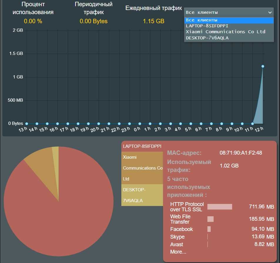 Ниже вы увидите два графика. Можно установить график для выделенного устройства или для всех. Как видите, здесь идет информация также по приложениям и протоколам, которые используются устройствами.