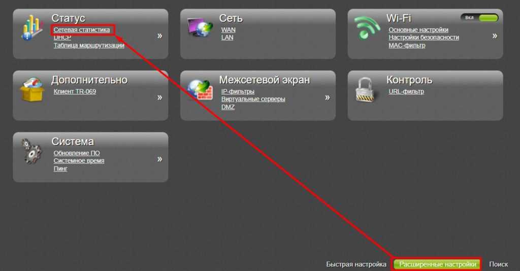 В расширенных настройках в разделе «Статус» переходим в «Сетевую статистику».