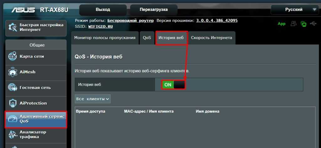 У ASUS также можно следить, кто на какие сайты заходит. Для этого переходим в «Адаптивный сервис QoS» – «История веб» – активируем функцию.