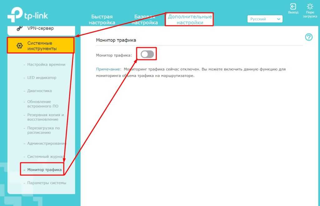 В новой прошивке перейдите «Дополнительные настройки» – «Системные инструменты» – «Монитор трафика» – включите функцию.