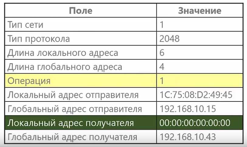 Компьютер, который хочет узнать МАК-адрес по известному IP-адресу, направляет ARP запрос “У кого IP 192.168.10.43?” Запрос отправляется на широковещательный МАК-адрес (FF:FF:FF:FF:FF:FF).