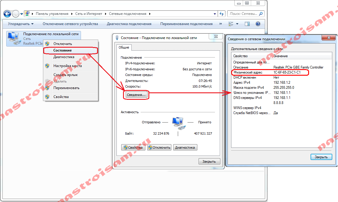 Выбираем пункт меню Состояние. В открывшемся окне Состояние сетевого подключения надо кликнуть на кнопке Сведения. В окне «Дополнительные сведения о сети» ищем поле «Физический адрес» — это и есть MAC-адрес сетевой карты.
