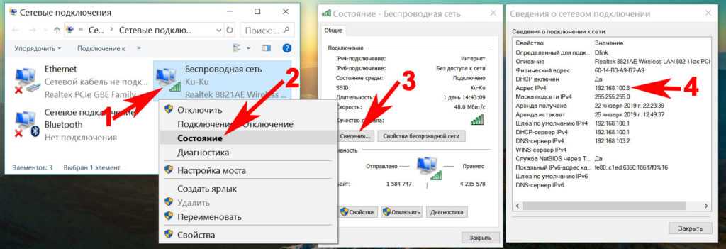 Появиться окно со всеми доступными адаптерами на ПК. Наводим курсор на активный адаптер и жмем правой кнопкой мыши, далее «Состояние», «Сведения…». В строке «Адрес IPv4» будет написан айпишник.