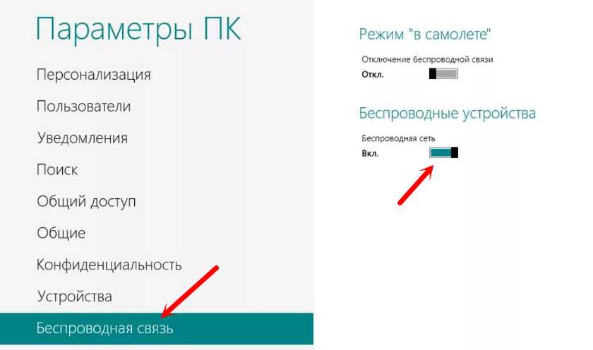 Откройте «Параметры». В разделе «Изменение параметров компьютера», нужно выбрать вкладку «Беспроводная связь». Затем включить беспроводную сеть.