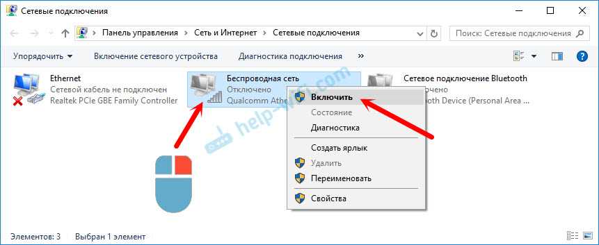 Для этого кликаем по ярлыку правой кнопкой мышки и выбираем «Включить». После этого модуль вай-фай автоматически начнет поиск доступных подключений и предложит вам список, среди которого необходимо найти и выбрать требуемую сеть.