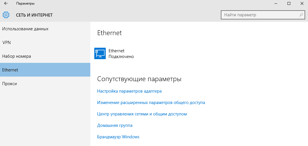 Попасть в меню настройки адаптера можно также через параметры Windows. Для этого нужно выбрать в них раздел «Сеть и Интернет» (подпункт Ethernet).