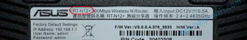 Сначала нам нужно скачать утилиту Firmware Restoration и прошивку для нашего маршрутизатора. Все это можно скачать на официальном сайте ASUS. На странице, которая посвящена конкретно нашему маршрутизатору. Поэтому, сначала нам нужно узнать модель роутера. Для этого посмотрите на наклейку снизу устройства. У меня ASUS RT-N12+.