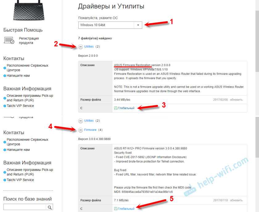 Дальше выбираем версию Windows, которая установлена на вашем компьютере. Открываем вкладку «Utilities» и скачиваем утилиту «ASUS Firmware Restoration» нажав на ссылку «Глобальный». Сохраняем ее на компьютер.