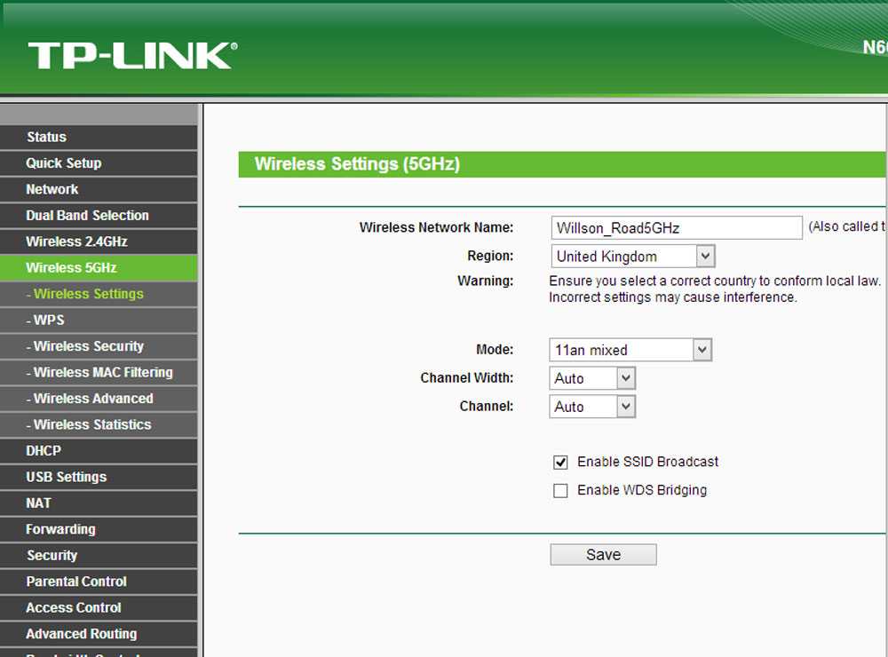 В меню интерфейса роутера выберите «Беспроводный режим» — «Настройки беспроводного режима». На появившейся странице вы увидите основные настройки беспроводной сети, в том числе здесь можно выбрать свободный канал для вашей сети. Не забудьте сохранить настройки.