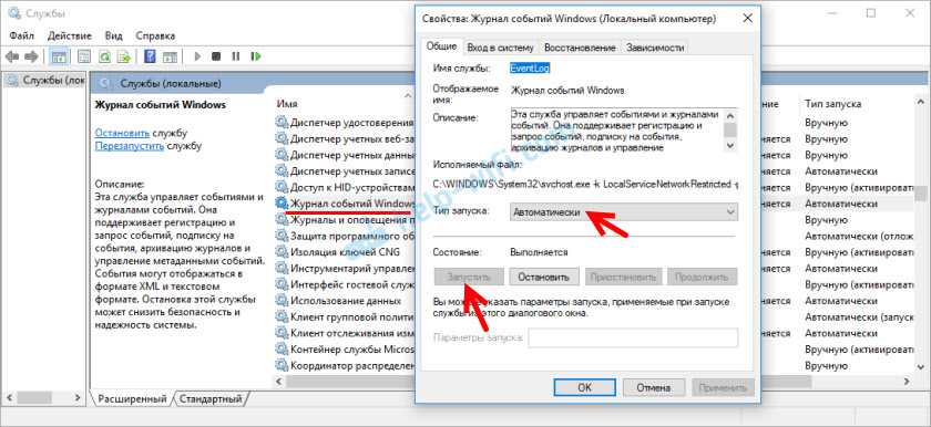 Находим службу «Журнал событий Windows» и открываем ее свойства (нажав на нее правой кнопкой мыши). Проверяем, установлен ли тип запуска «Автоматически» и запущена ли сама служба. Если нет – нажимаем на кнопку «Запустить». Можно попробовать остановить ее и запустить заново.