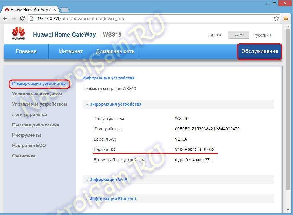 При подключении роутера Huawei WS319 (как и любого другого роутера) к сети Интернет, для начала надо соединить его Ethernet-кабелем с ПК, а затем ввести в браузере адрес веб-интерфейса роутера. У Huawei WS319 веб-адрес — 192.168.3.1, в открывшихся полях «пользователь» и «пароль» вводим «admin» и «admin».