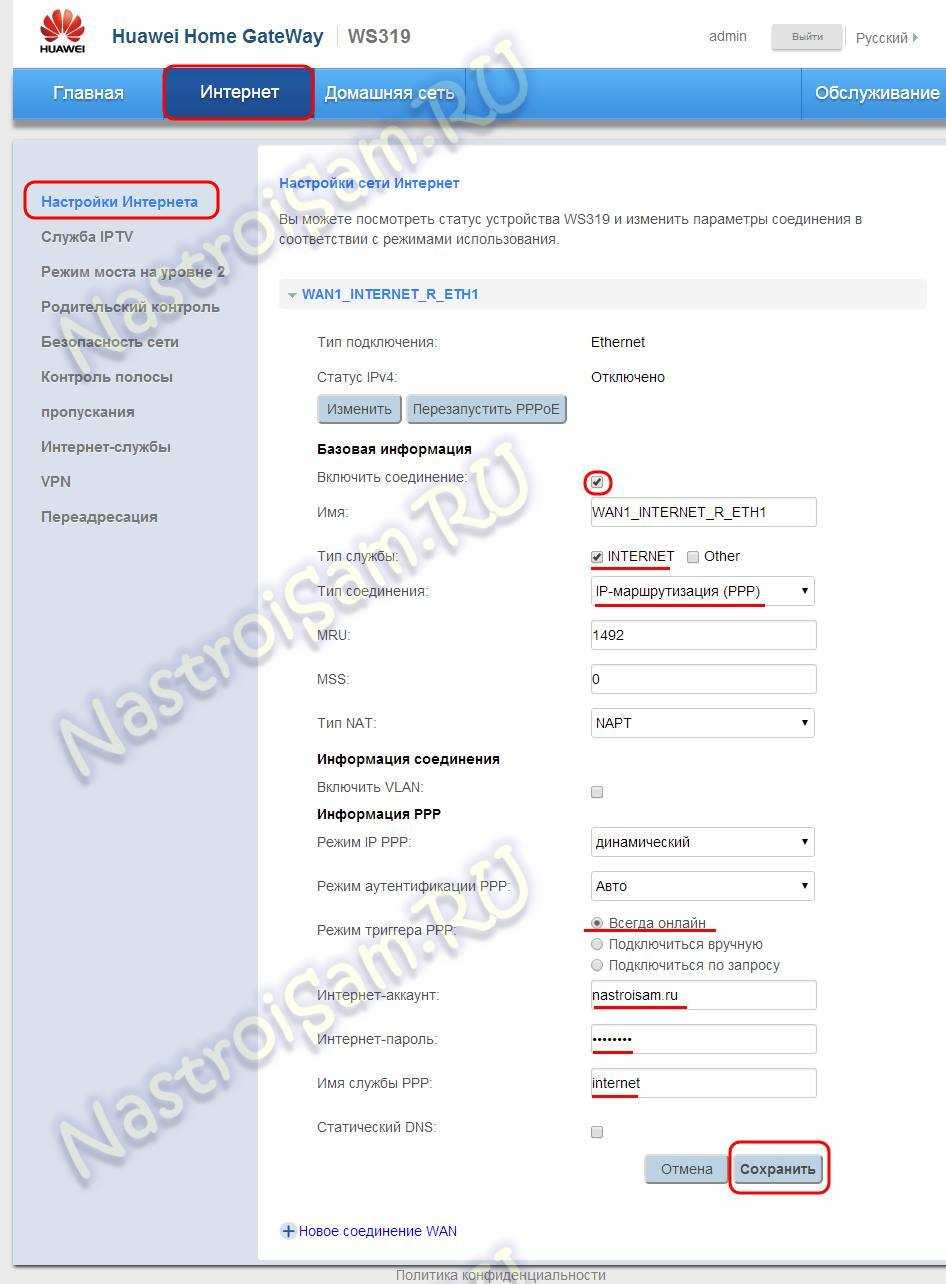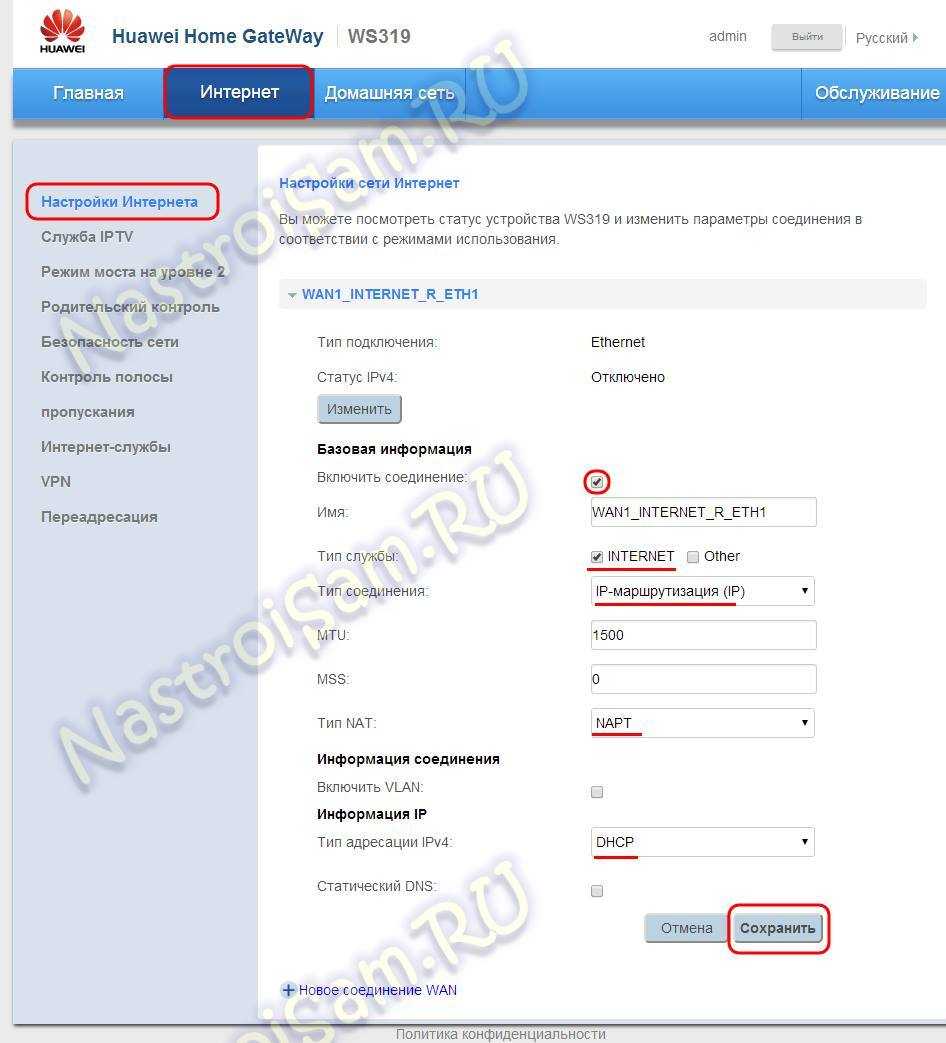 «Настройки Интернета» в веб-интерфейсе роутера Huawei WS319