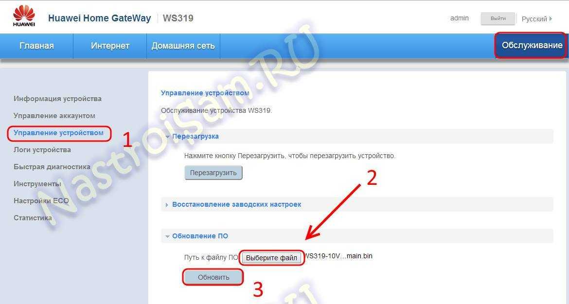 Скачать прошивку можно отсюда — ссылка. Для обновления микропрограммы надо зайти в раздел «Обслуживание» => «Управление устройством»: