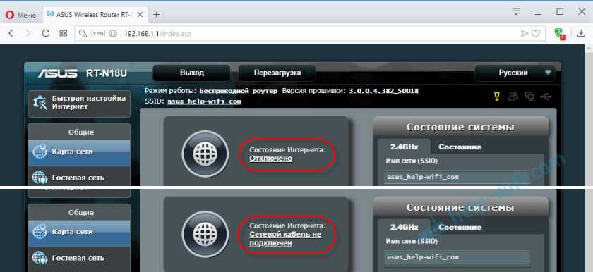 Но лучше, конечно, зайти в настройки своего маршрутизатора (это можно сделать через браузер, чаще всего по адресу 192.168.1.1, или 192.168.0.1), и на главной странице, где как правило отображается вся информация (в том числе о подключении), посмотреть статус подключения к интернету (WAN). Смотрим на примере роутера ASUS.