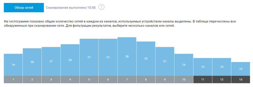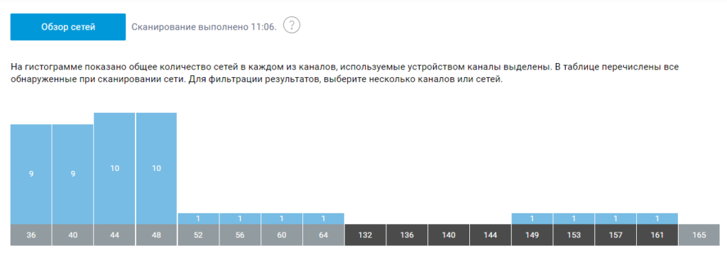 А вот на гистограмме 5 ГГц диапазона все куда более прозаичнее. Есть свободные каналы, а сетей обнаружено всего 12 штук. Что позволяет вполне комфортно существовать в эфире.