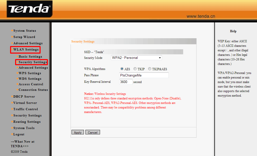 Tenda W311R+ поддерживает множество вариантов алгоритмов шифрования – без шифрования, WEP, WPA, WPA2, смешанный WPA/WPA2, при этом поддерживаются и некоторые нестандартные сочетания, например для режима 802.11n можно выбрать шифрование WPA2 с алгоритмом TKIP. Чего нет ни в каких сочетаниях, так это поддержки RADIUS, работать с RADIUS-сервером устройство не умеет.