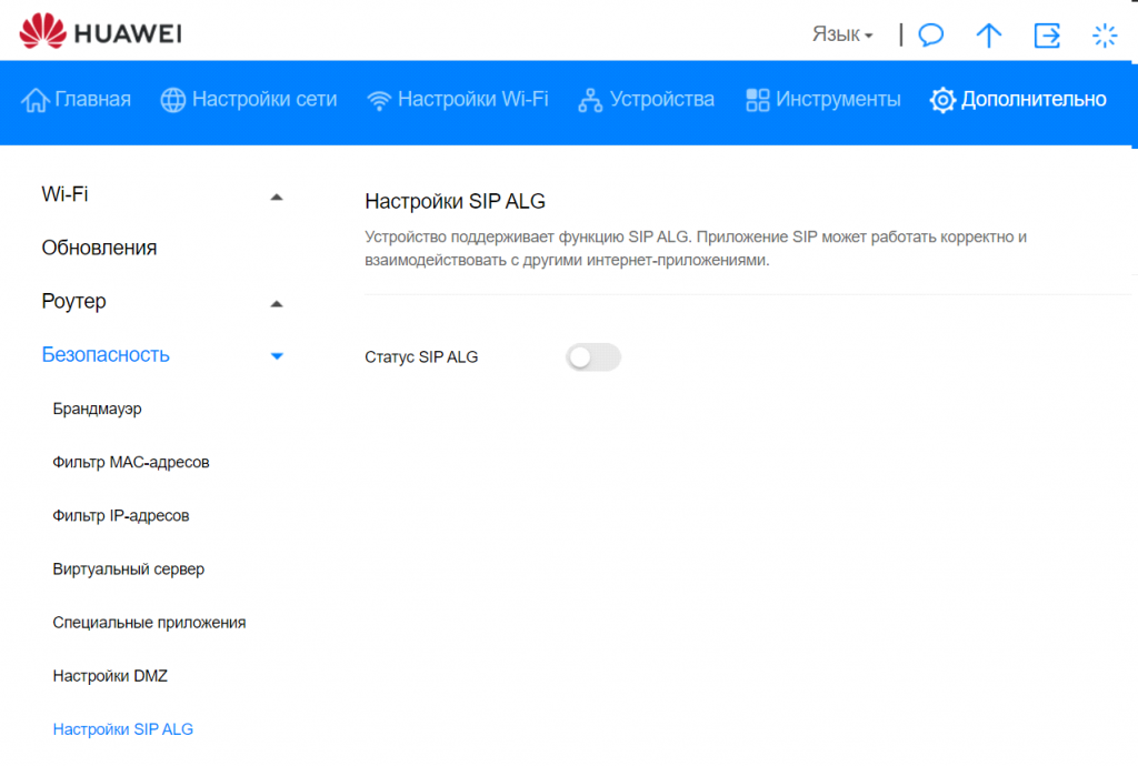 Если вы планируете использовать IP-телефонию через LTE сеть, отключаем SIP ALG. Находится в меню под названием: Дополнительно -> Безопасность -> Настройки SIP ALG.