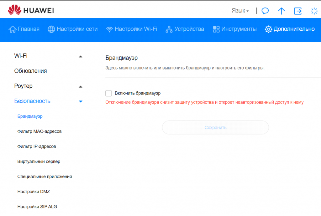 Далее переходим в ветку Дополнительно -> Безопасность -> Брандмауэр. Отключаем его.