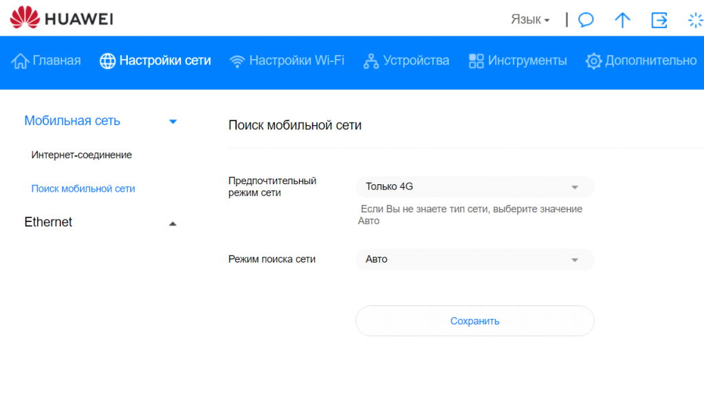 Далее переходим в параметр Поиск мобильной сети. Здесь требуется выбрать Предпочтительный режим: Только 4G. Делается это во избежание переключений роутера между сетями GSM, UMTS и т.д. Нажимаем Сохранить.