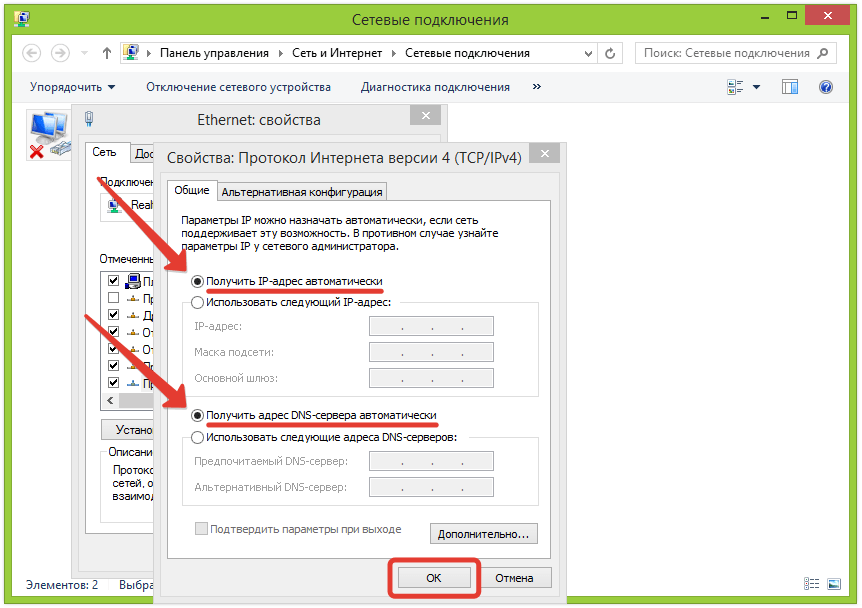 5. В открывшемся окне «Свойства — Протокол Интернета версии 4» вам нужно поставить точки в верхнее положение «Получить IP-адрес автоматически» и «Получить адрес DNS-сервера автоматически» после чего нажмите «ОК». Если точки уже стоят в верхнем положении, ничего не делайте.