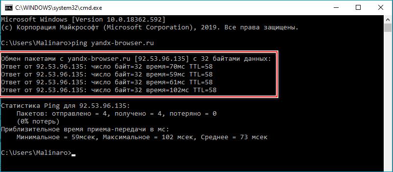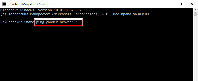 - В командном окне введите команду для проверки задержки между используемым вами компьютером и сайтом, с которого вы не можете загрузить файл: ping yandx-browser.ru, где yandx-browser.ru — это имя сайта, на котором загрузка файла в яндекс браузере прервана.