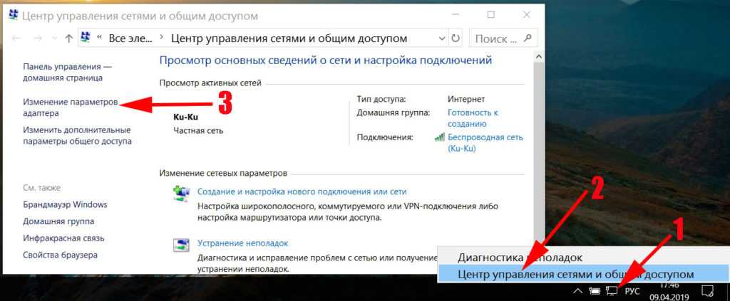 Откройте «Центр управления сетями и общим доступом» и «Изменение параметров адаптера».