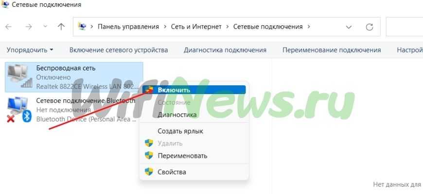 - Откроется окно, в котором выбирают конкретное устройство. Здесь могут отображаться и проводные адаптеры, которые никому не интересны, хотя при желании тоже могут быть включены. Нужно выбрать интересующий вариант, потом нажать правой кнопкой и перейти по строчке «включить». С Windows 7,10 работают так же как Windows 11.