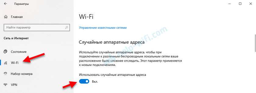 Включить ее можно в параметрах, в разделе «Сеть и Интернет» на вкладке «Wi-Fi». Возле «Использовать случайные аппаратные адреса» установите переключатель в положение Вкл.