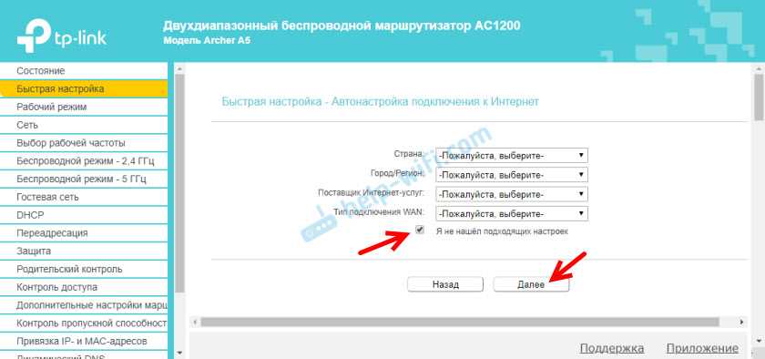 Если вашего провайдера там нет, то установите галочку возле «Я не нашел подходящих настроек» и нажмите «Далее».