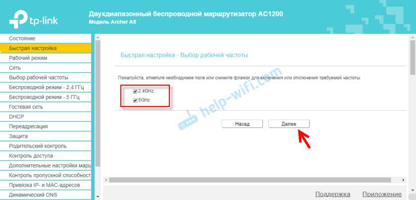 Дальше нужно выбрать рабочую частоту беспроводной сети, так как роутер у нас двухдиапазонный. Если вы, например, не хотите, чтобы роутер раздавал Wi-Fi на частоте 5 ГГц, то снимите галочку возле соответствующего пункта. Позже можно будет включить трансляцию Wi-Fi в данном диапазоне, в настройках роутера. Раздел «Выбор рабочей частоты».