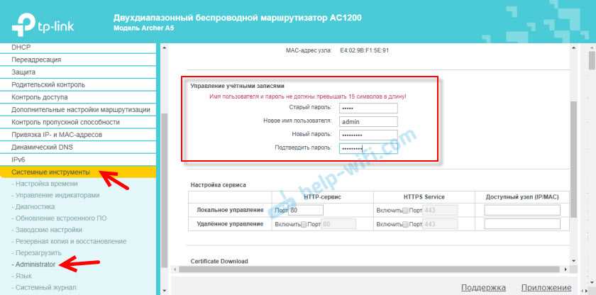 Рекомендую еще перейти в раздел «Системные инструменты» – «Administrator» и сменить пароль администратора роутера. Вместо admin установить какой-то другой. Чтобы доступ к настройкам был только у вас, а не у всех клиентов, которые будут подключаться к роутеру. Имя пользователя можно оставить admin.