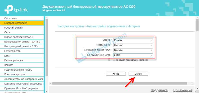 В этом роутере есть много предустановленных настроек интернет. Для разных стран, городов, провайдеров. Выберите своего провайдера и тип подключения, который он использует и нажмите «Далее».