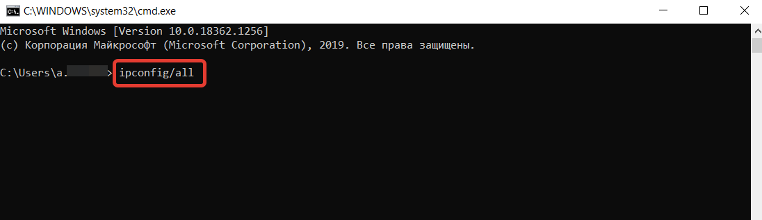 - В командную строку вбиваем команду ipconfig/all.