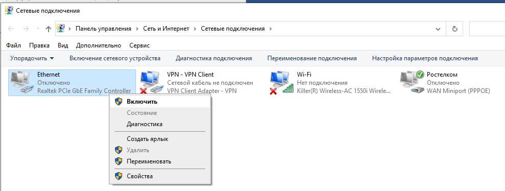 - Далее вы увидите все ваши физические и программные подключения. У всех будет «Ethernet» подключение – это как раз коннект по кабелю. Если «Ethernet» или «Wi-Fi» горят серым и имеют надпись: «Отключено» – активируйте их, нажав ПКМ и выбрав «Включить».