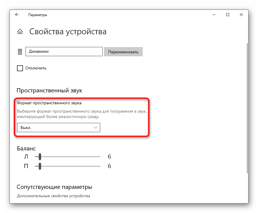 Если речь идет о встроенной в операционную систему функции, придется выполнить описанные ранее действия, чтобы открыть меню «Свойства устройства». Там вы найдете параметр «Формат пространственного звука» и из выпадающего списка сможете выбрать вариант отключения.