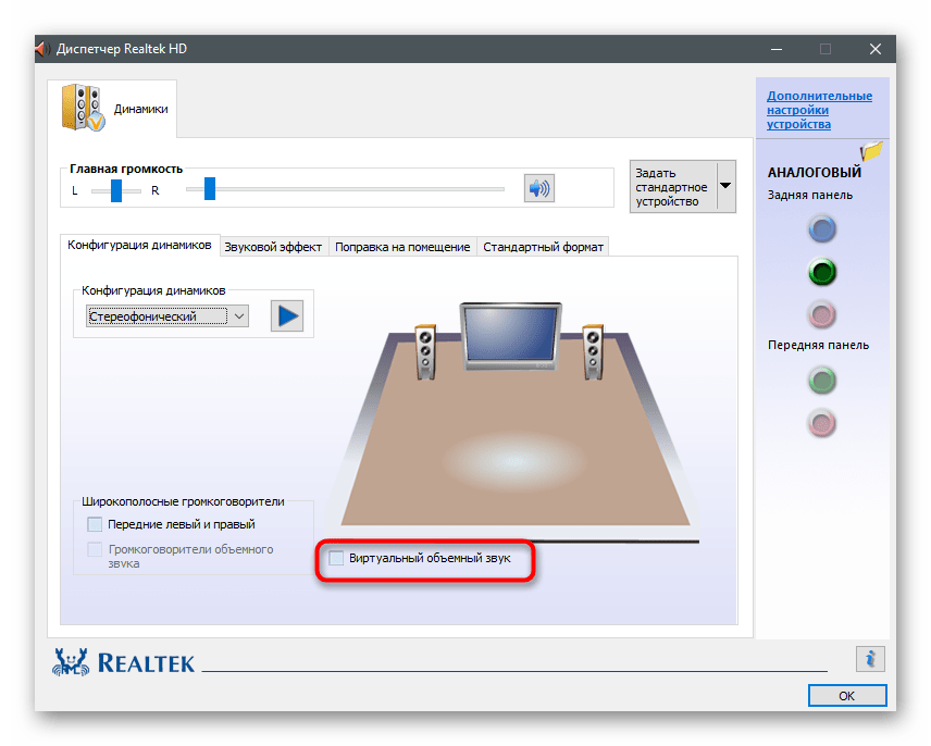 Сейчас практически все драйверы для звуковых карт поддерживают виртуальный объемный звук, который особенно полезен при игре в шутеры, где важную роль играет позиционирование врага. Однако эта функция используется и при воспроизведении фильмов или музыки, привнося новые нотки в звучание. Не все наушники корректно справляются с этой функцией, поэтому и возникает ощущение того, что одно «ухо» играет тише другого. В Диспетчере управления звуком эта возможность отключается в один клик на главной вкладке и называется «Виртуальный объемный звук».