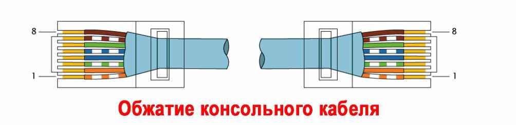 В этом варианте нужно один конец витой пары обжать по обратной схеме, по отношению к другому концу. Выглядит это, как будто вы перевернули его и глянули на штекер с другой стороны. Эту схему обжатия применяют, когда необходимо настроить роутер или коммутатор при помощи ПК. Чаще всего используют для устройств Cisco.
