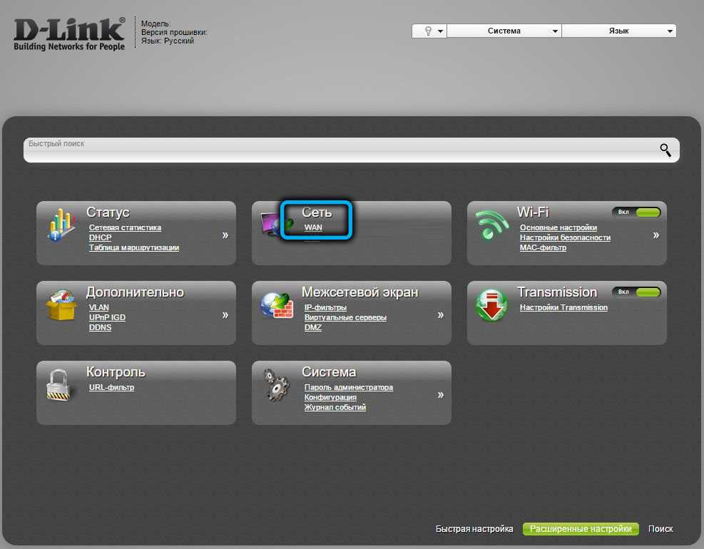 Если все введено верно, должна открыться главная страница интерфейса управления, которая может иметь различный внешний вид в зависимости от версии прошивки.