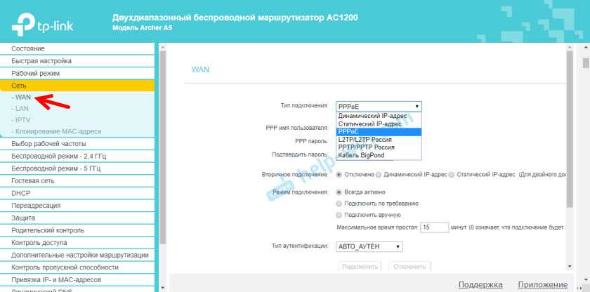 - Настройка подключения к интернету: В меню веб-интерфейса перейдите в раздел «Сеть» («Network») или «Интернет» («Internet»). Выберите тип подключения в соответствии с информацией, предоставленной вашим интернет-провайдером (например, PPPoE, Dynamic IP или Static IP). Введите необходимые данные, такие как имя пользователя, пароль или IP-адрес, и нажмите «Сохранить» («Save»).