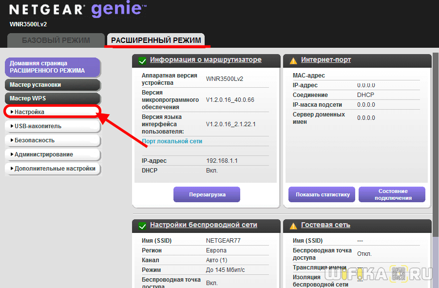Попадаем в панель администратора Netgear. Как видим, под значком «Интернет» красный цвет, который означает, что в данный момент подключение не активно. Можно воспользоваться функцией быстрой настройки роутера, но чтобы контролировать весь процесс подключения, рекомендую сразу перейти в «Расширенный режим»