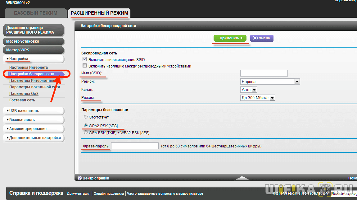 Зайдя в веб-клиент роутера, перейдите во вкладку беспроводной сети, чтобы установить нужное имя и пароль подключения — это позволит в дальнейшем обходиться без проводов. Дальнейшие настройки сугубо индивидуальны и зависят от провайдера. Большинство российских поставщиков услуг выдают клиенту памятку, в которой указываются оптимальные настройки роутера — в этом случае действовать придётся строго по инструкции.