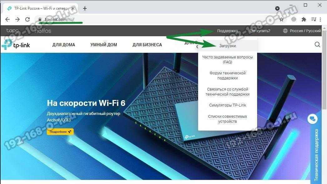 У меня модель устройства TP-Link Archer C7 V4. Теперь надо открыть сайт компании TP-Link и там открыть раздел Поддержка ⇒ Загрузки.