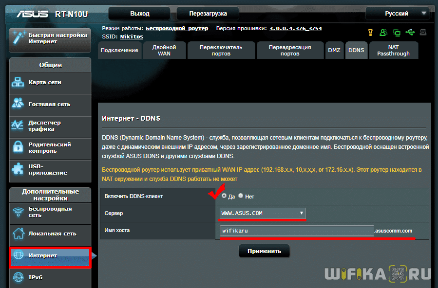 На роутере ASUS кроме этого стандартного набора, который есть почти во всех маршрутизаторах, есть еще возможность зарегистрироваться в собственном DDNS сервисе, который является бесплатным для пользователей. Его настройка находится в меню «Интернет», вкладка «DDNS».