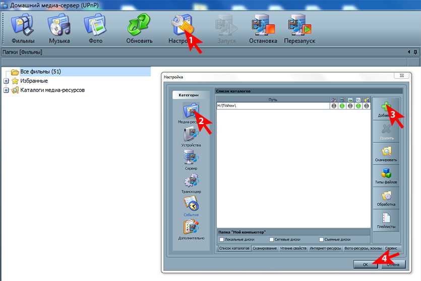 Кнопка «Настройки» вверху —> категория «Медиа-ресурсы» —> кнопка «Добавить», выбираем путь —> прожимаем кнопки отображаемых данных
