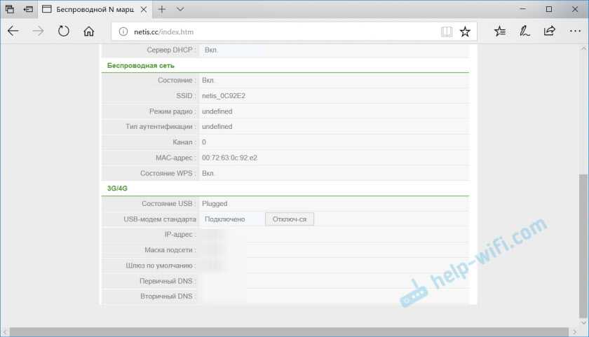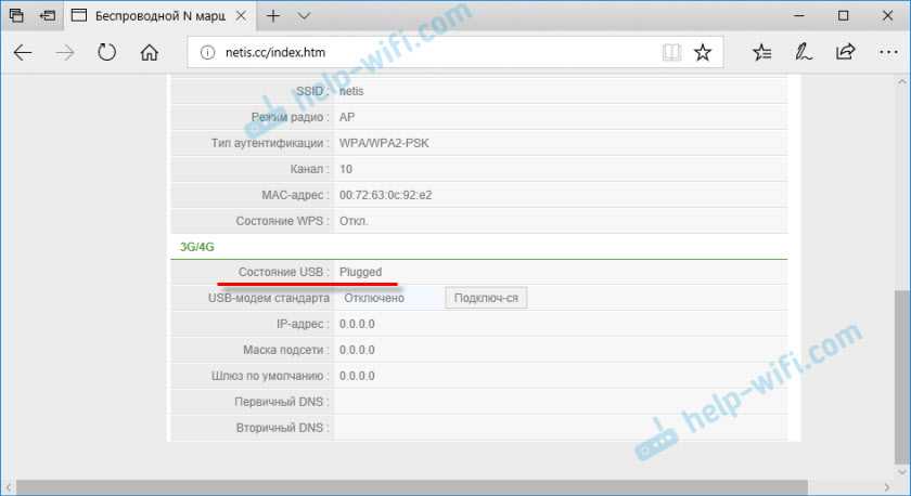 На вкладке «Состояние», в самом низу будет раздел «3G/4G». В строке «Состояние USB» отображается статус подключенного модема. Насколько я понял, когда состояние «Plugged», значит модем подключен. Можно переходить к настройке.