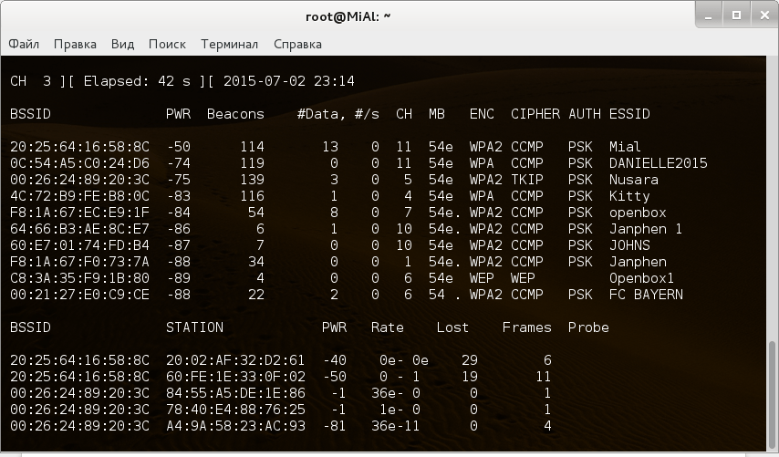 Нам нужно задать essid, bssid, channel и mon. Эти данные можно взять из вывода airodump-ng.