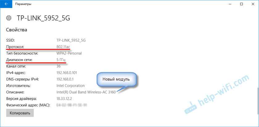 Я устанавливал модуль Intel Dual Band Wireless-AC 3160. Dual Band — значит двухдиапазонный. Может подключаться к сетям на частоте 2.4 GHz и 5 GHz. У меня ноутбук еще 2012 года, и там конечно же стоял обычный модуль стандарта 802.11n. Разумеется, что ноутбук не видел беспроводные сети на частоте 5 GHz.